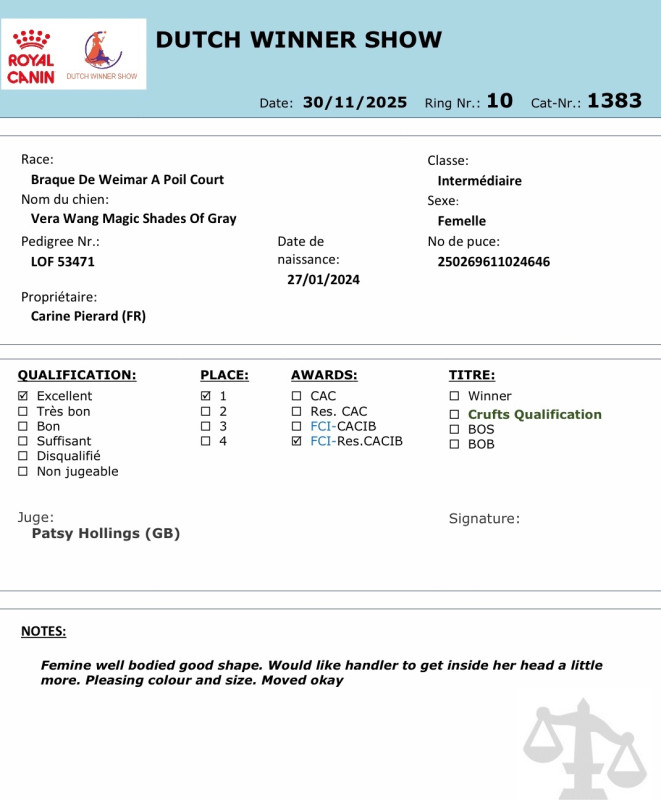 Première Régionale d Élevage du Braque de Weimar dans notre région (Grand Est) Multi JCh -CIE.J Vera Wang Magic Shades Of Gray dite Vic. Sous le jugement de Mme Nathalie Parent, Vic a remporté la classe intermédiaire femelles puis a poursuivi sur sa lancée en obtenant le Meilleur de Sexe Opposé. Une immense fierté pour sa première Régionale d Élevage. Nous sommes très fiers de ce beau résultat, heureux de voir la descendance de Preston & Nala mise en valeur, et surtout ravie d avoir partagé cette journée dans une ambiance chaleureuse, avec le plaisir de revoir des personnes que nous n avions pas croisées depuis longtemps et d en rencontrer de nouvelles. Merci à Stéphanie d avoir relevé le défi d organiser cette grande première avec l aide de la CUCC. Un grand bravo à toi, tu as géré ça avec brio. Le cadre est magnifique, il est déjà posé fièrement sur mon étagère. Père : EW 25 Preston Wittelsbach Del Monte Alban V-EW 22 -FR 22 - CIE - Multi BIG - BISS-BIS-III-Multi Ch.-Multi GCh.-Multi Top Dog-CAC WDS 2023 Mère : Multi Ch.-CIE -CIB-Cotation 2 Oyma du Chêne Sessile.